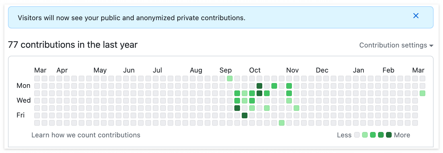 그러면 아래 이미지처럼 Visitors will now see your public and anonymized private contributions. 라는 메시지가 뜨면서 완료된다.