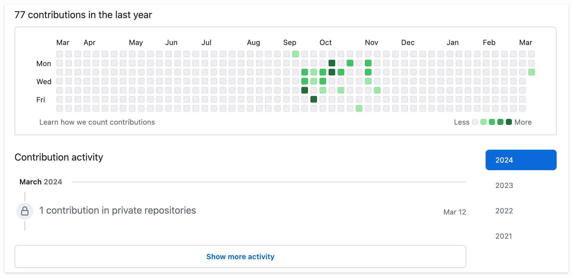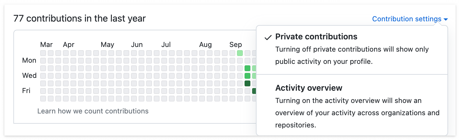 내가 private repository에 커밋한 흔적이 잔디에 남는걸 다른 사람들도 볼 수 있게 하려면, 잔디 우측 상단에 있는 Contribution settings를 누른 후 Private contributions를 눌러준다.