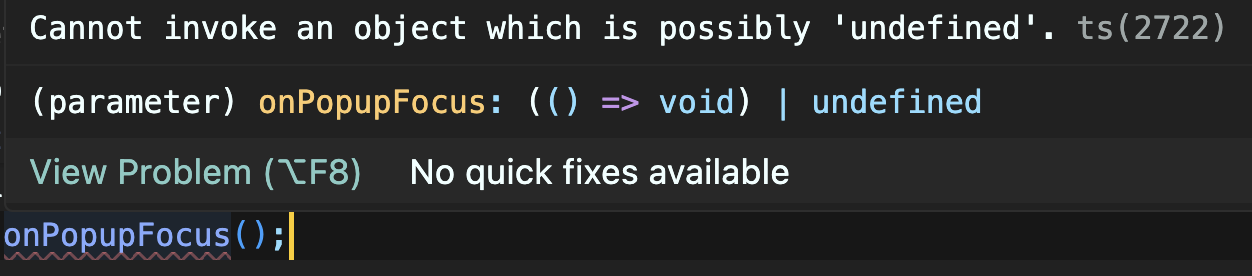 이것은 onPopupFocus와 onPopupDefocusf라는 함수의 타입을 선언할 때 onPopupFocus?와 같이 물음표를 함께 적어 필수로 선언되지 않아도 되는 값이라고 정의했기 때문이다. 정의되지 않은 값을 이후에 호출할 수도 있으니 타입스크립트 입장에서 경고를 준 케이스다. 따라서 해당 함수들이 정의되지 않은 undefined인 케이스를 고려해주면 된다.