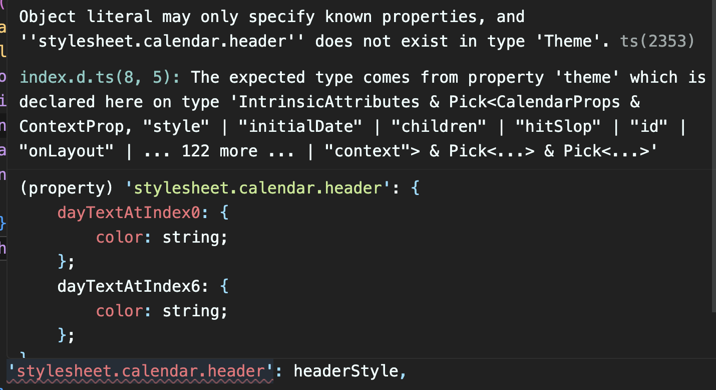 타입스크립트 프로젝트에서 react-native-calendars 패키지를 사용하여 Calendar 컴포넌트 내에 theme props에 'style.calendar.header' 선언 시 아래 에러가 발생하는 것을 확인하였다.