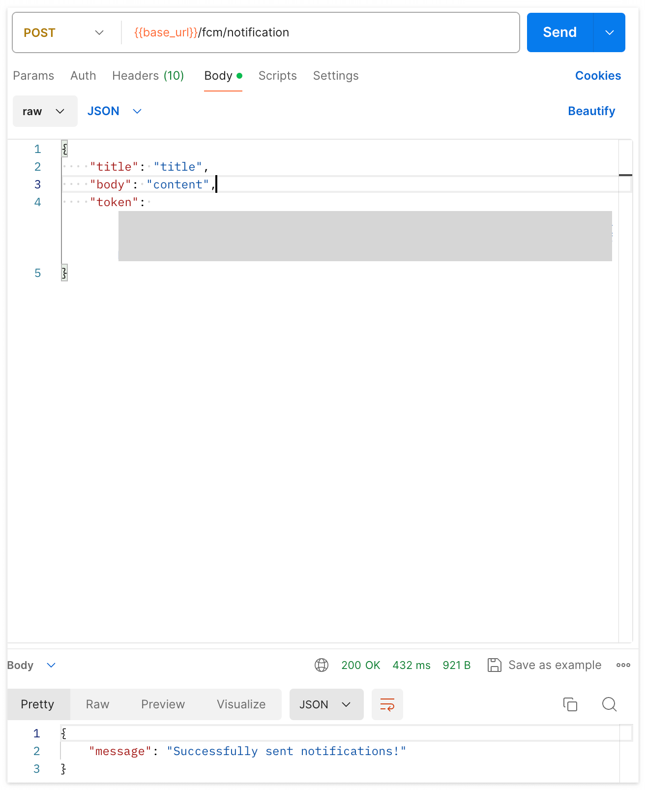작성한 코드를 호출하는 router를 만든 후에 API를 날려보면 200 OK 응답과 함께 정상적으로 fcm이 작동된 것을 확인할 수 있다.