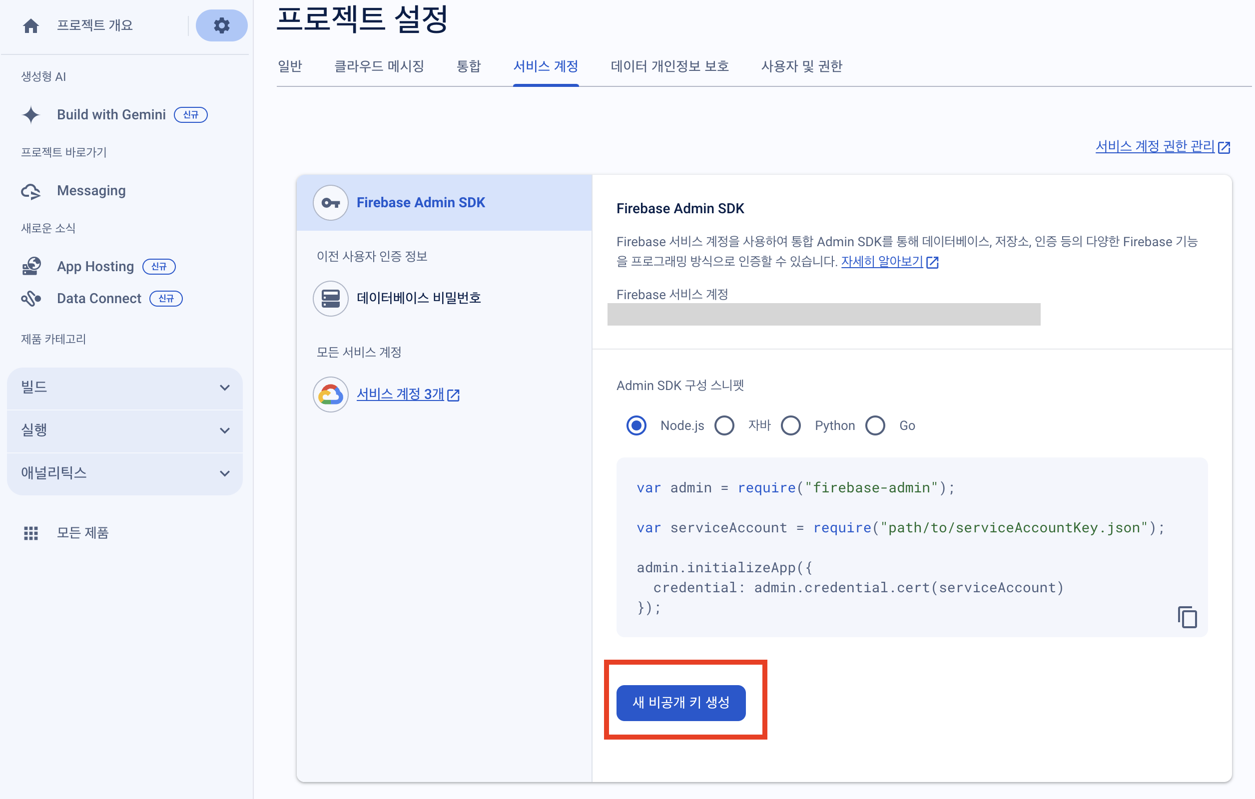 firebase 프로젝트 콘솔 > 프로젝트 설정 > 서비스 계정 > '새 비공개 키 생성' 버튼 클릭