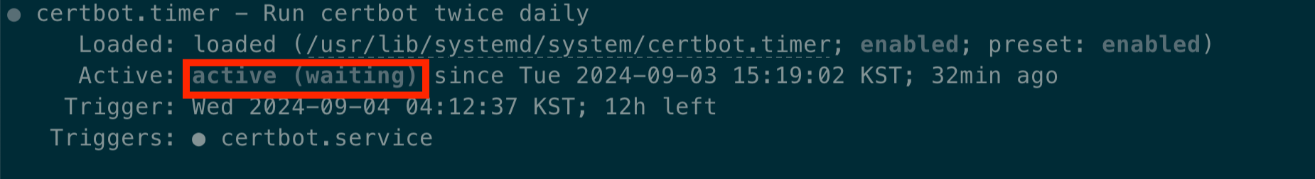 아래 명령어를 사용해보면 certbot.timer에 대한 더 자세한 내용을 확인해 볼 수 있다.